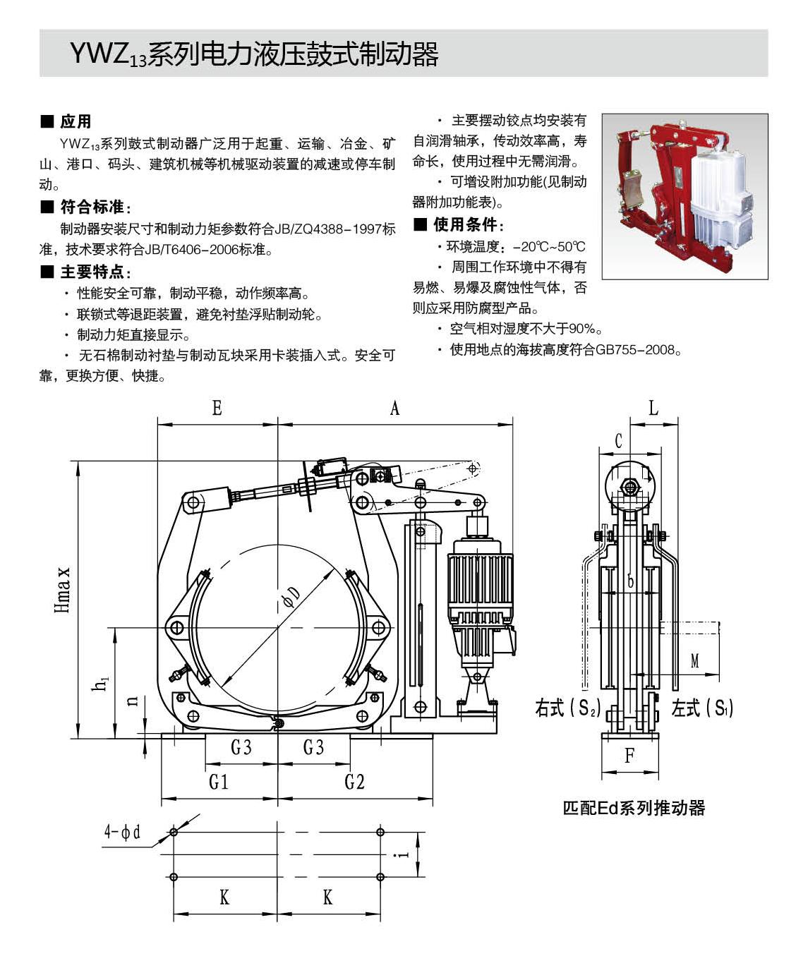YW,YWZ13系列电力液压鼓式制动器的连接尺寸和技术要求符合JB / T6406-2006标准;制动力矩参数符合DIN15435标准,配套符合DIN15430标准的Ed系列推动器。