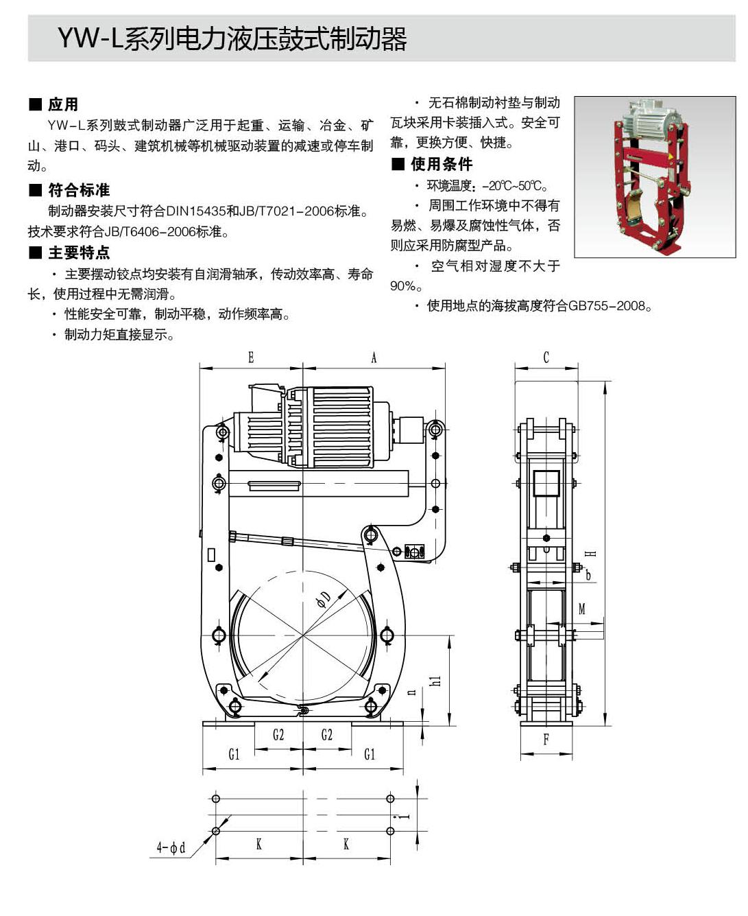 YW-L系列制动器安装尺寸及制动力矩参数符合JB/T6406-2006标准和DIN15435标准。配套符合DIN15430标准的Ed系列推动器。