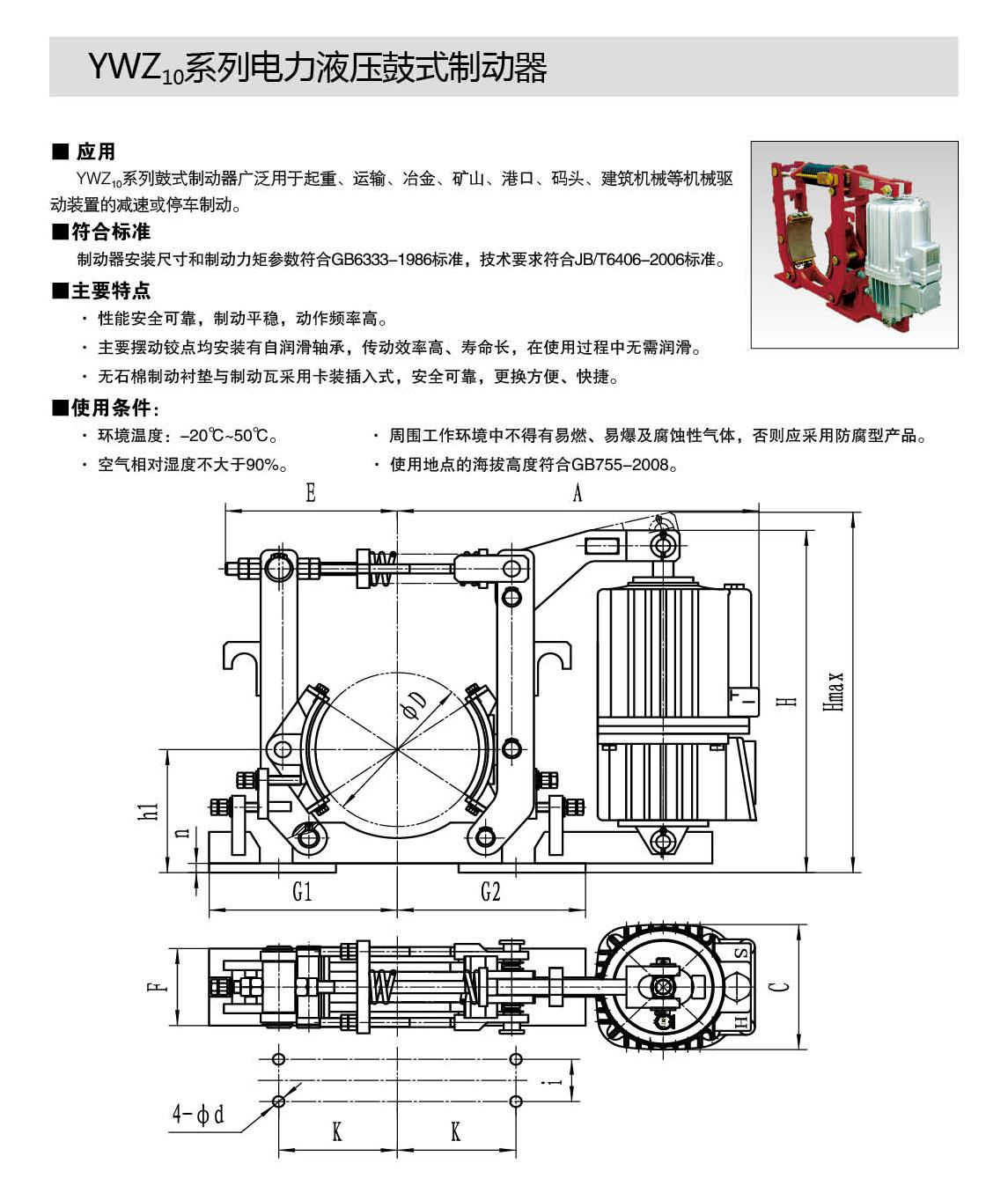 YWZ10系列电力液压鼓式制动器的连接尺寸和制动力矩参数符合GB6333-86标准,技术要求符合JB / T6406-2006标准,配套符合DIN15430标准的Ed系列推动器。
